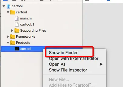 2.成功运行cartool项目后,找到Proucuts文件下的cartool,并show in finder