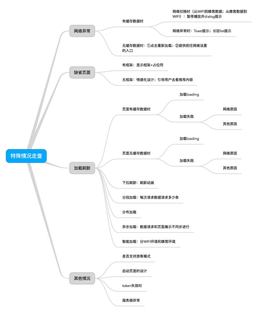 不同产品根据自身的特点,需要走查的点是不一样的,例如:涉及多媒体播放和下载的产品,才需要考虑网络环境切换时的情况;必须强制登录的产品就不需要考虑游客模式的设计,等等。