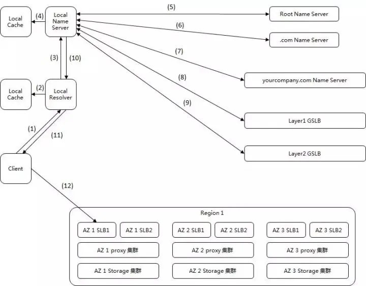 我们首先先通过DNS访问数据中心中的对象存储上的静态资源为例子,看一看整个过程。