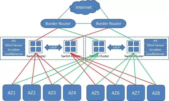如果一个AZ出现了问题,是否可以让对某个公网IP的访问给另一个AZ呢?当然是可以的,在核心路由和核心交换之间,可以做ECMP等价路由。当然也可以在边界路由上将外部地址NAT称为内部的一个VIP地址,通过等价路由实现跨AZ的流量分担。