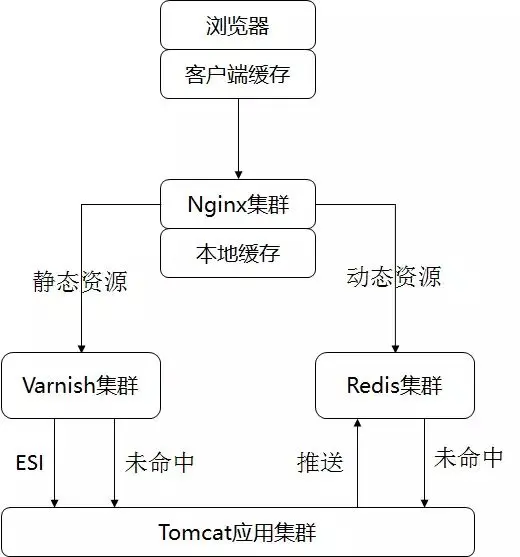 所以应该在接入层nginx中配置动态资源和静态资源的分离,将静态资源的url导入到nginx的本地缓存或者单独的缓存层如varnish或者squid,将动态的资源访问后端的应用或者动态资源的缓存。