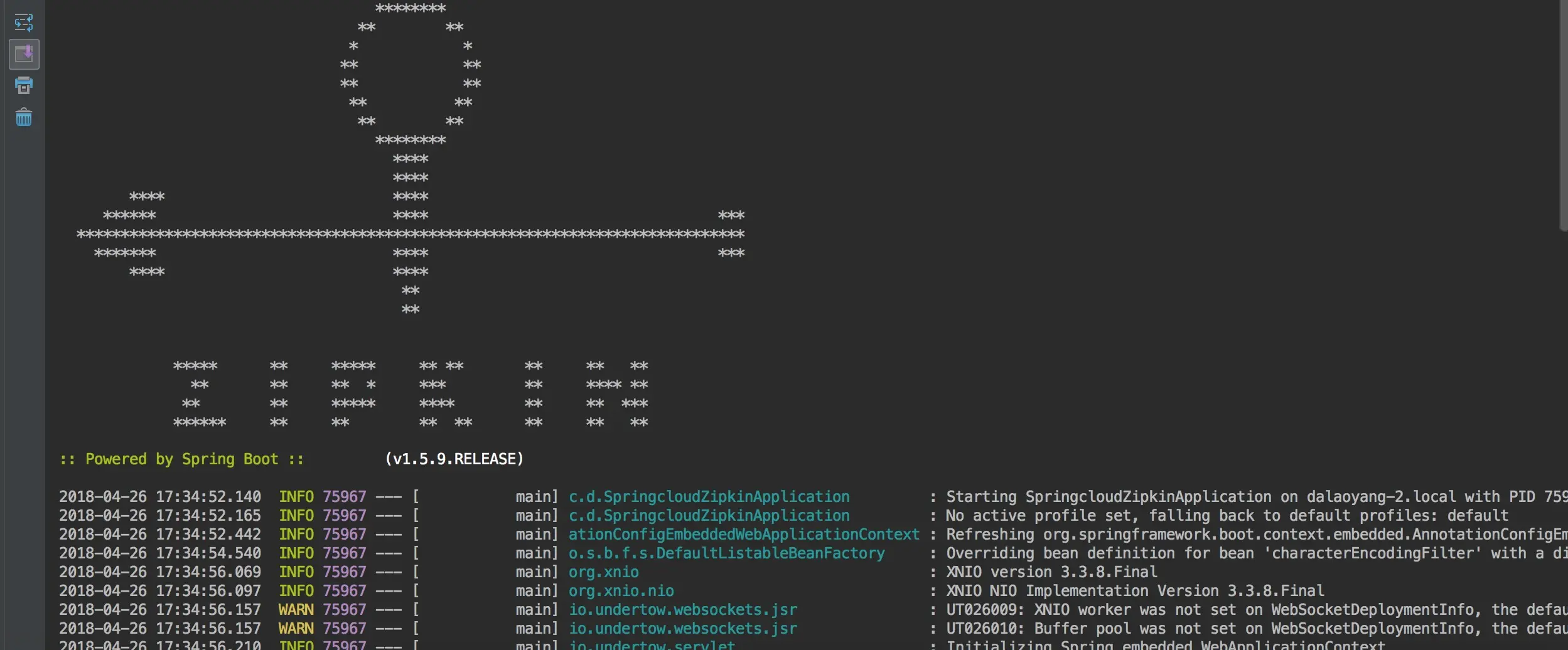 启动类加入注解@EnableZipkinServer,来声明是一个ZipkinServer,启动项目,可以看到控制的log已经变化了,如图
