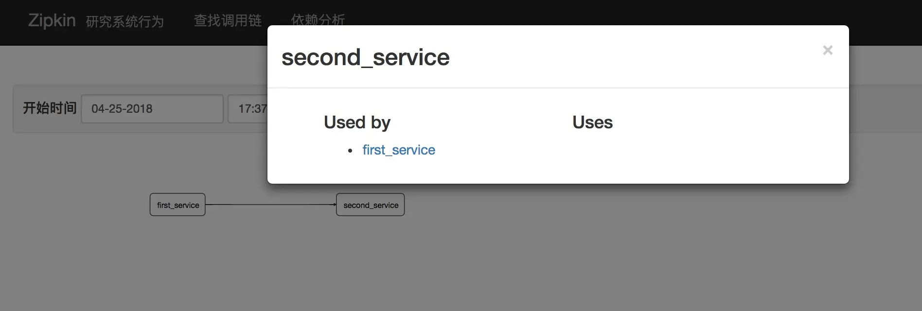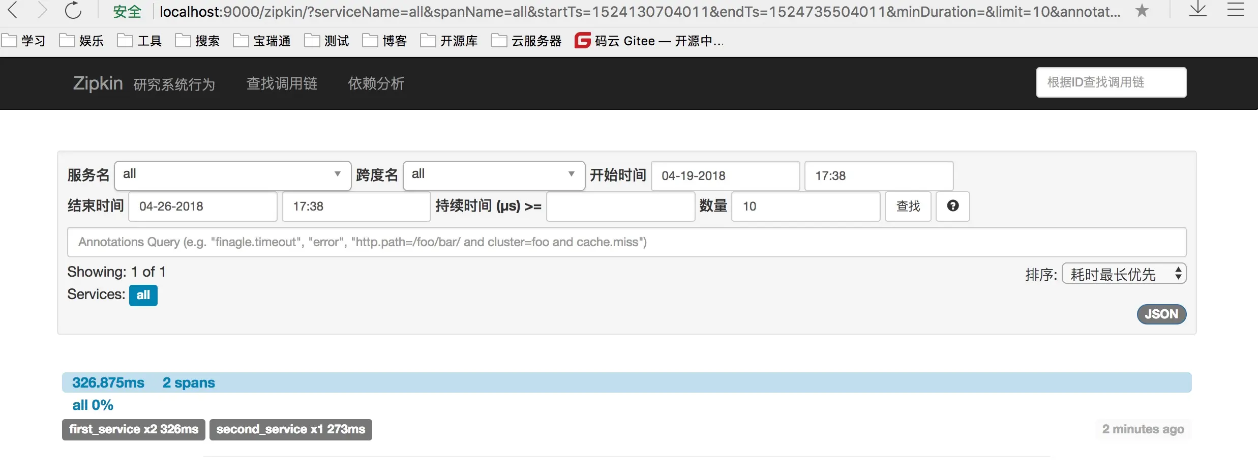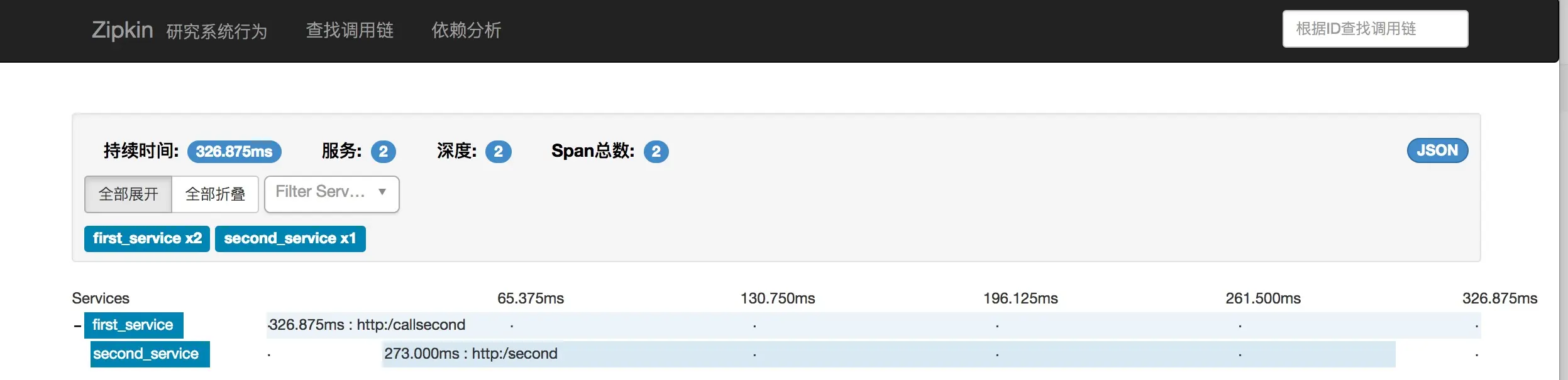 启动这两个项目,浏览器访问http://localhost:9001/callSecond,然后观看Zipkin Server页面,可以看到调用关系,请求细节等,如下图: