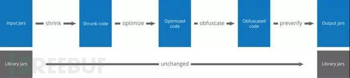 Proguard处理流程图如下所示,包含压缩、优化、混淆、预检四个主要环节: