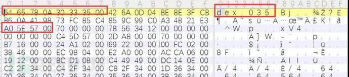 整体Dex加固逆向分析有两种常用的方法。其一是在内存中暴力搜索 dex\n035,再 dump。以下是在32位系统中的效果示例:
