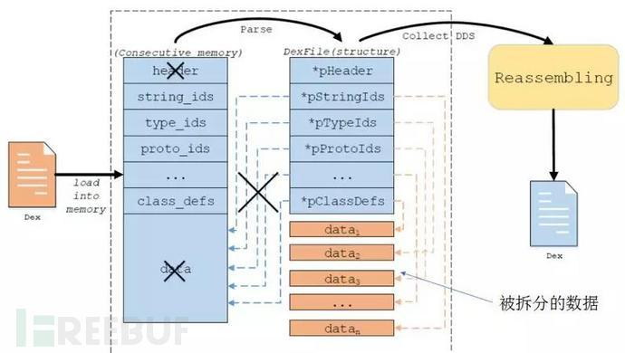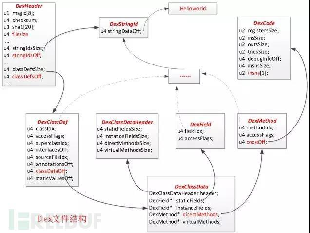但是如上所示,dex文件在加固时,针对中间缺失的一部分数据会以解密后的数据来替换,有的时候这种拆分替换也会导致数据不准确。那么到底应该拆分什么样的数据呢?就需要了解一下dex文件的数据结构。