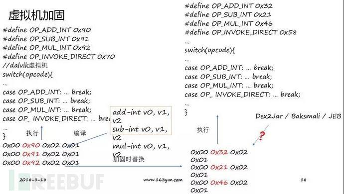 虚拟机加固也属于dex拆分加固的一种,它是对字节做了一些变化处理。如下所示,这是一个正常安卓系统中的代码,在其中进行了虚拟机加固操作: