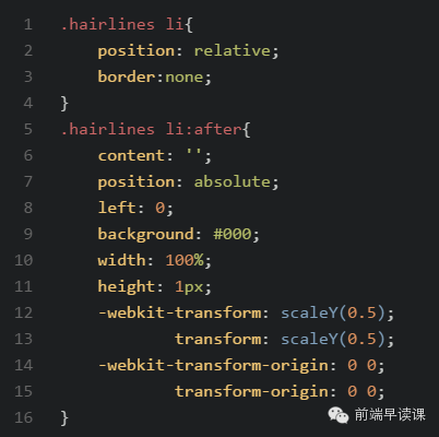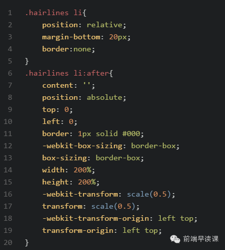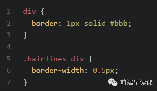 原理是把原先元素的 border 去掉,然后利用 :before 或者 :after 重做 border ,并 transform 的 scale 缩小一半,原先的元素相对定位,新做的 border 绝对定位