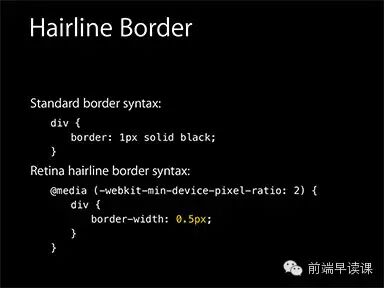 在 2014 年的 WWDC,“设计响应的 Web 体验” 一讲中,Ted O’Connor 讲到关于“retina hairlines”(retina 极细的线):在 retina 屏上仅仅显示 1 物理像素的边框,开发者应该如何处理呢。