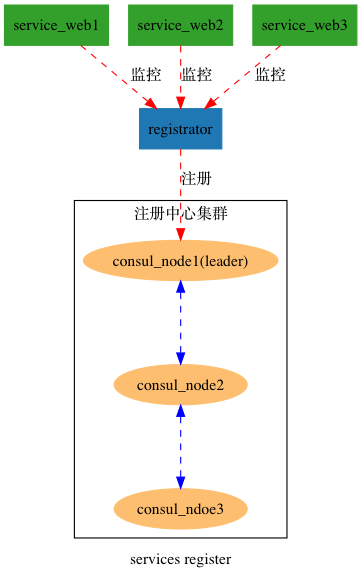 示例中包含3台consul node构成consul cluster,1台registrator监控服务,3台service web 提供服务。 具体架构如下: