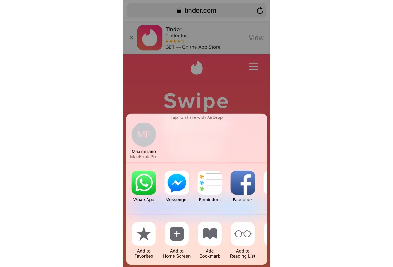 当你访问 Tinder.com,你可以忽略顶部的原生应用 banner 并点击分享,添加到主屏幕。如果你想为用户提供安装教程,务必注意这些按钮会根据系统语言进行本地化调整。