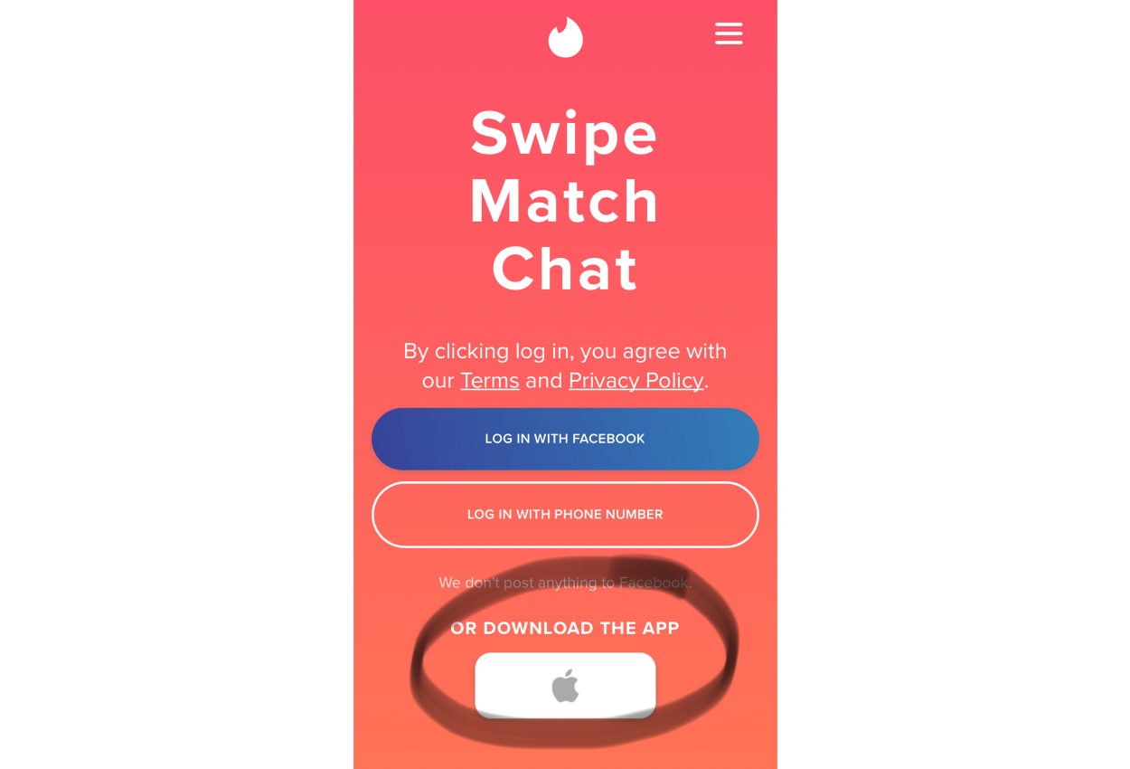 当然,大部分 Web 应用会提供一个链接,让你可以从 App Store 中安装原生应用,PWA 应用中也有这样一个链接,就像下面这个 Tinder 例子: