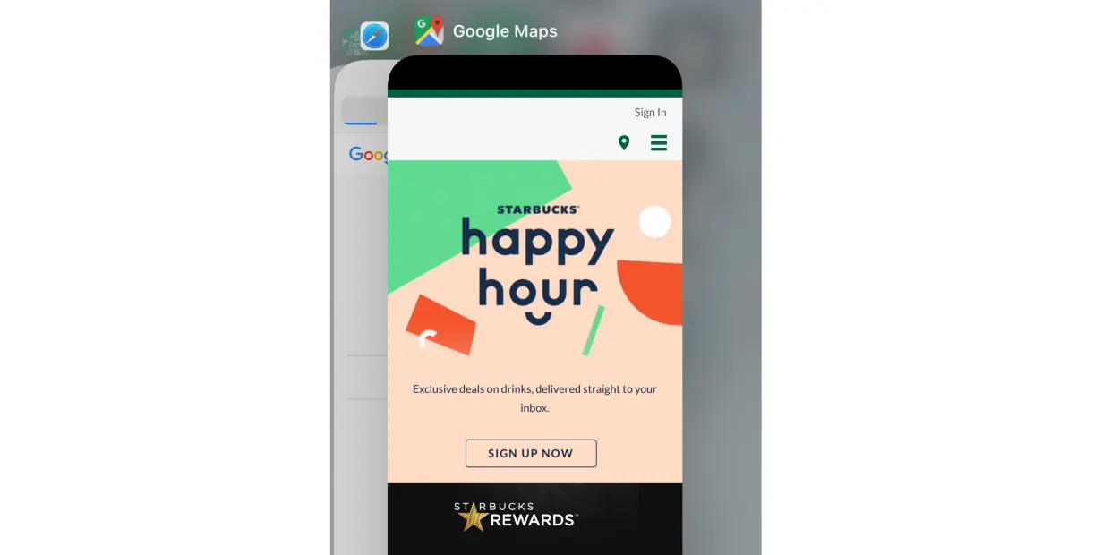一个带有星巴克商标的 Google 地图?不,这只是打开了一排 PWA 应用之后的 iOS 系统。在最近使用的应用列表中出现这种奇怪的现象,是因为一个应用加载错了地址