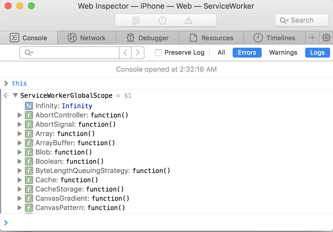 - 要想在 iOS 上调试 Service Workers,你需要安装 Safari 技术预览版(Safari Technology Previce)或者 macOS 10.11.5,10.12.6和10.13.4更新版本的 Safari 11.1。