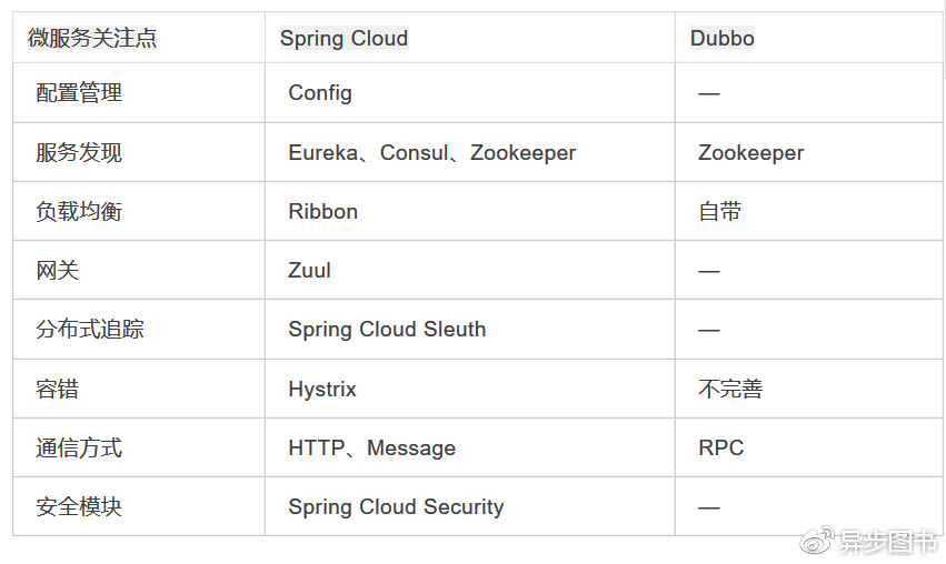 表1 从微服务关注点比较Spring Cloud和Dubbo