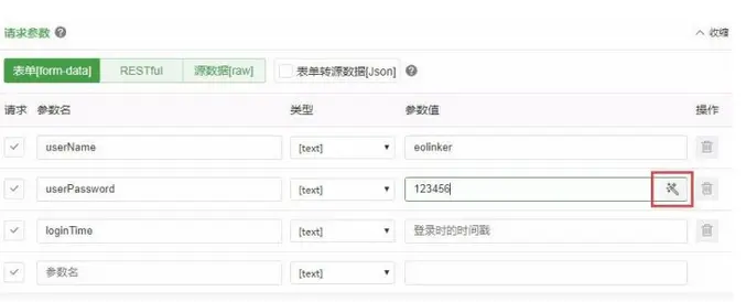 eoLinker AMS接口管理平台中,为接口测试提供了强大的“表达式构造器”,只需要输入简单的值并且点击几下鼠标,就可以得到处理后的请求参数。