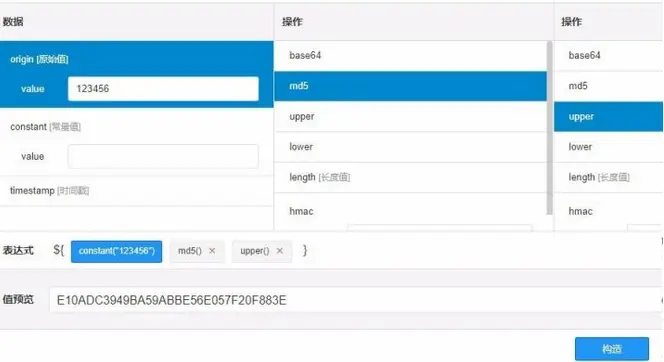 我们在表单中填写好需要处理的值之后,点击输入框右方的“表达式构造器(魔法棒)”按钮,就会弹出“参数构造器”弹框。