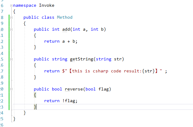 然后新建需要被调用的CSharp类代码。这里我们新建一些简单的方法,为了演示效果我们分别对int、string、bool进行操作。如图: