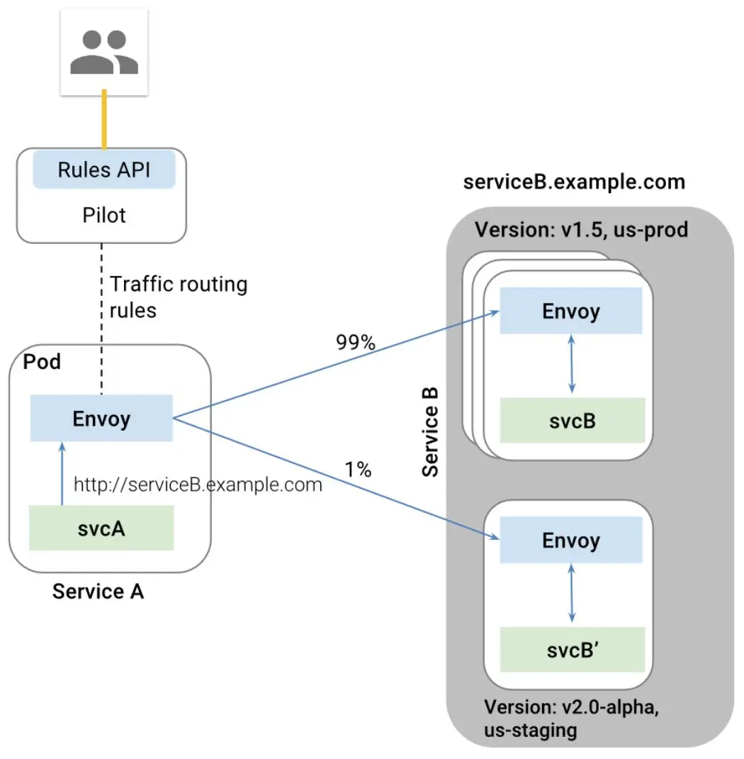 常见的一种人工规则是Routes,通过服务发现,Pilot可以从Kubernetes那里知道Service B有两个版本,一般是两个Deployment,属于同一个Service,管理员通过调用Pilot的Rules API,来设置两个版本之间的Route规则,一个占99%的流量,一个占1%的流量,这两方面信息形成Pilot的数据结构模型,然后通过Envoy API下发,Envoy就会根据这个规则设置转发策略了。