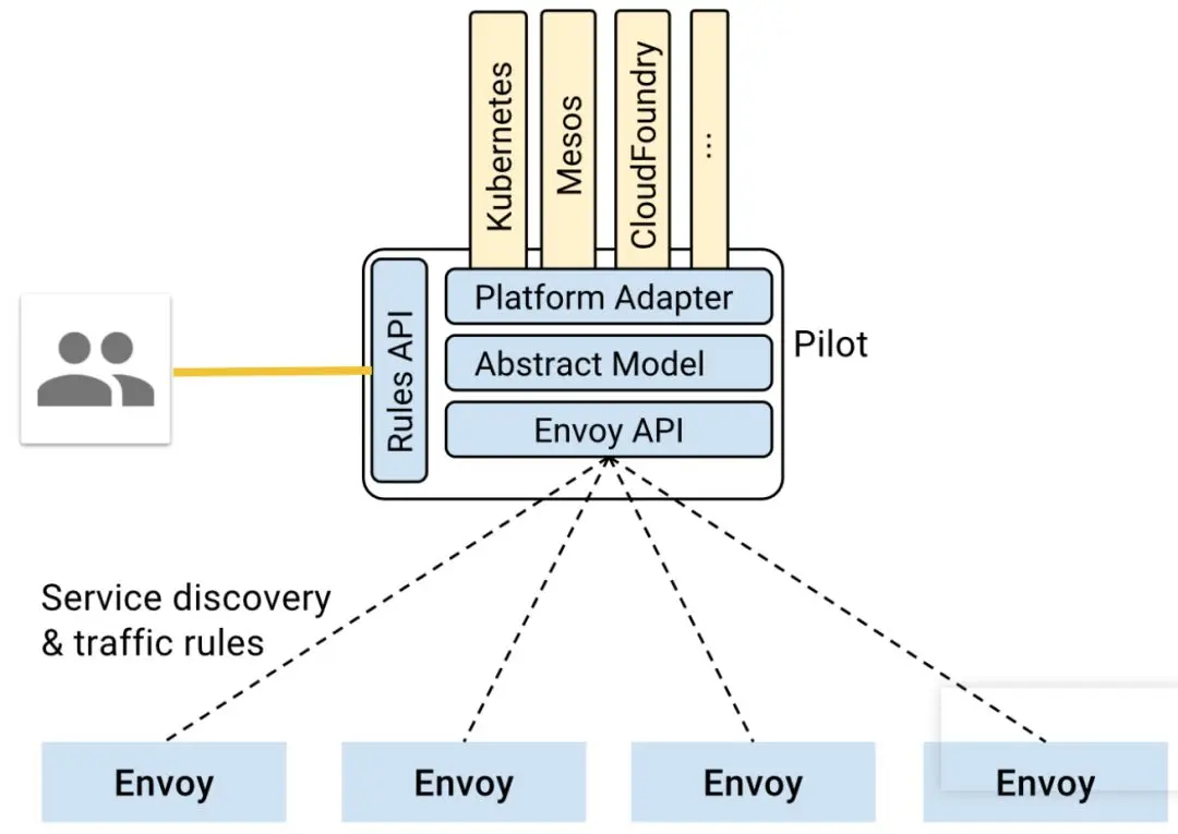 如图为Pilot的架构,最下面一层是envoy的API,就是提供Discovery Service的API,这个API的规则由envoy定,但是不是Pilot调用Envoy,而是Envoy去主动调用Pilot的这个API。