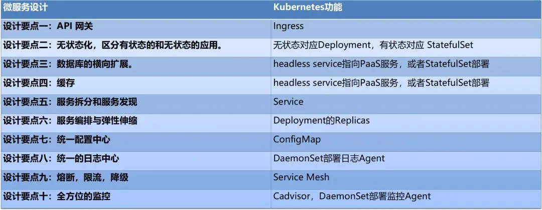 在我们微服务设计的是个要点中,我们会发现Kubernetes都能够有相应的组件和概念,提供相应的支持。