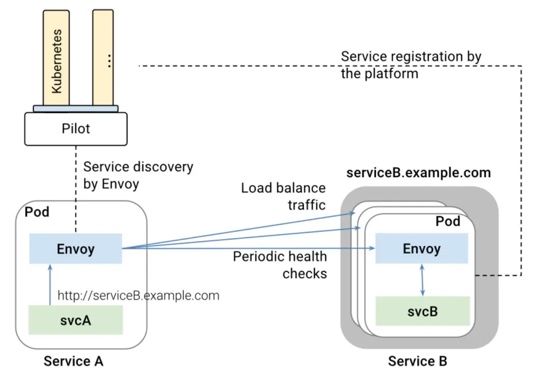 Pilot最上面一层称为Platform Adapter,这一层是干什么的呢?这一层不是Kubernetes, Mesos调用Pilot,而是Pilot通过调用Kubernetes来发现服务之间的关系。