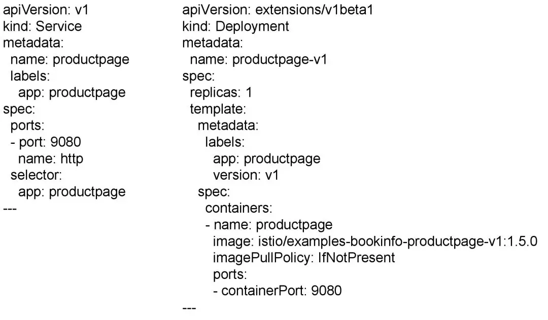 首先定义了一个Deployment,使用bookinfo的容器镜像,然后定义一个Service,用于这个Deployment的服务发现。