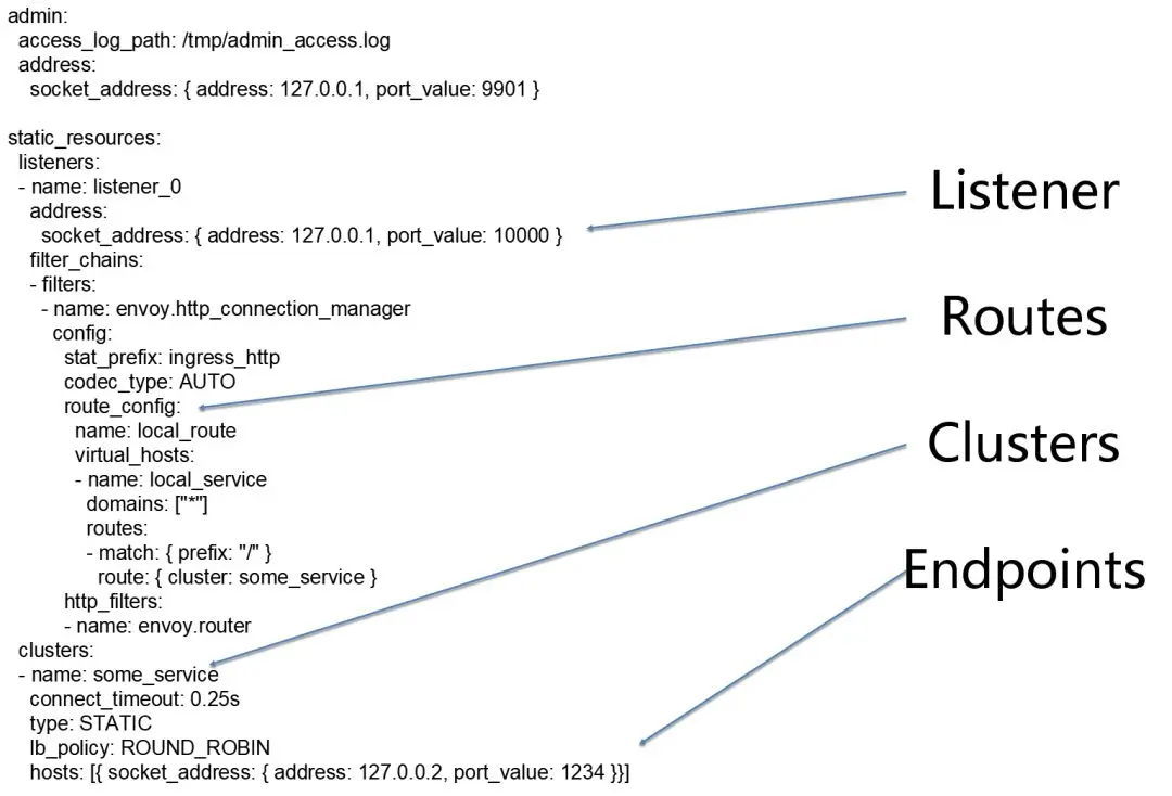 如图所示,listener被配置为监听本地127.0.0.1的10000接口,route配置为某个url的前缀转发到哪个cluster,cluster里面配置负载均衡策略,hosts里面是所有的endpoint。