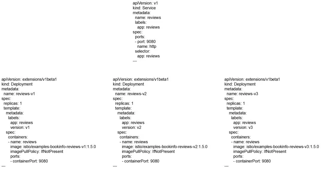 最后定义了一个Service,对应的label是app: reviews,作为这三个Deployment的服务发现。