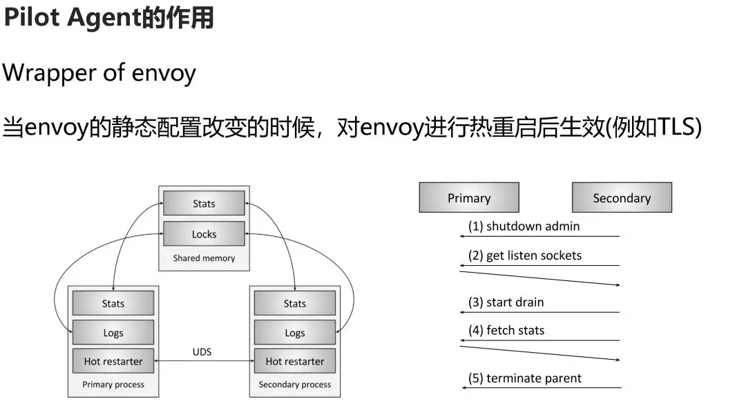 这就是pilot-agent的作用,他是envoy的一个简单的管理器,因为有些静态资源,如果TLS的证书,envoy还不支持动态下发,因而需要重新静态配置,然后pilot-agent负责将envoy进行热重启加载。