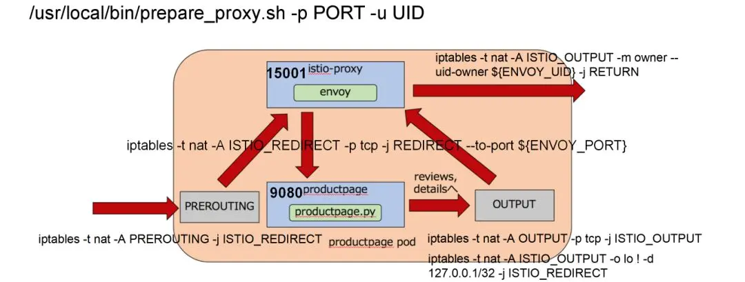 当productpage往后端进行调用的时候,就碰到了output链,这个链会使用转发链,将所有出容器的请求都转发到envoy的15000端口。