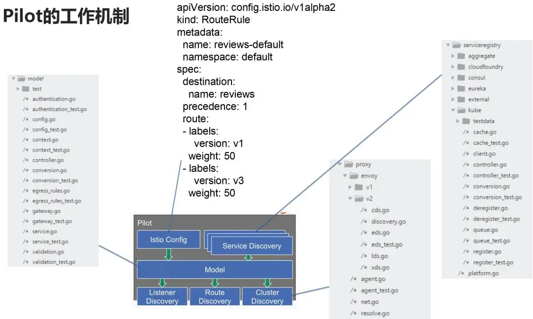 自动发现的这些Clusters和Endpoints,外加管理员设置的规则,形成了Pilot的数据模型,其实就是他自己定义的一系列数据结构,然后通过envoy API暴露出去,等待envoy去拉取这些规则。