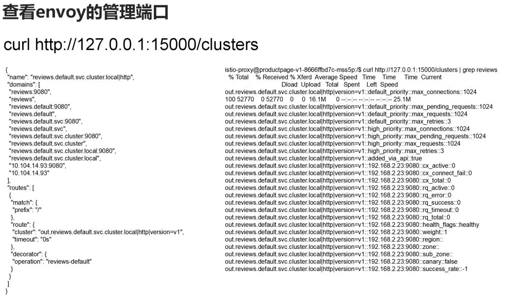 我们查看envoy的管理端口,可以看到只配置了reviews的v1。