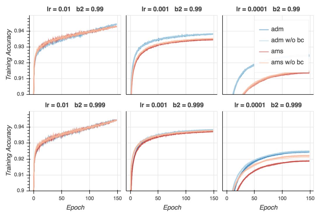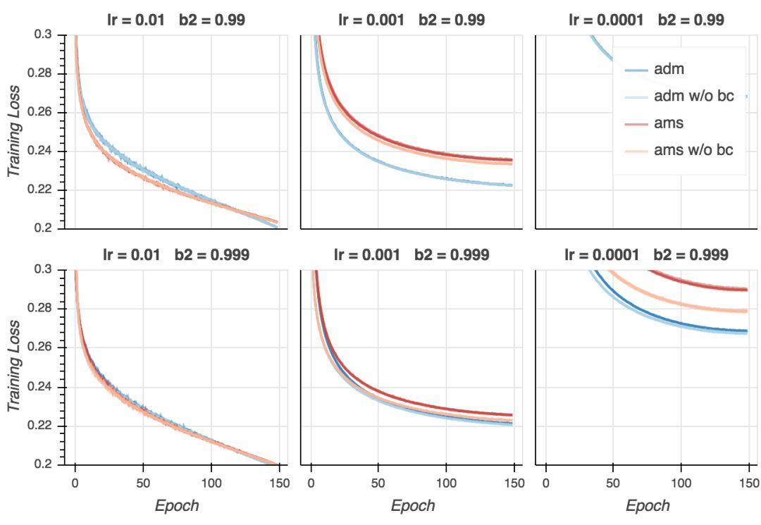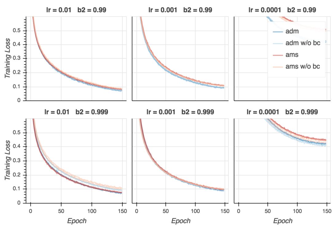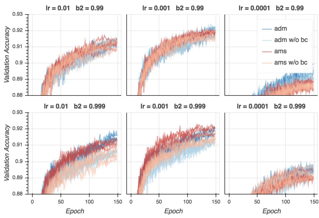 在我的试验中,训练损失非常接近0,而论文中的数值则是0.3. 这当然是因为我用的是大得多的模型。我们同时看到,如果学习率不是太低的话,AMSGrad看起来在最后的训练阶段收敛得快一点,并且大多数情况下,使用偏置纠正有助于收敛。不过,最后所有变体在大多数超参数配置下(学习率过低除外)收敛至相似的最终损失。如果我们仔细查看,我们会发现在最后的若干epoch上Adam超越了AMSGrad。这没什么大不了的——毕竟这是训练损失。然而,这类模型(以及训练方案)和论文中报告的CifarNet模型的结果很不一样,论文中的情况是,AMSGrad的训练损失比Adam低很多。