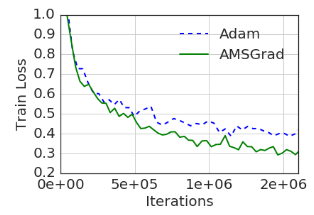 在ICLR 2018最佳论文On the Convergence of Adam and Beyond(关于Adam的收敛性及其他)中,Google的Reddi等指出了Adam收敛性证明的缺陷,并提出了一个Adam算法的变体AMSGrad。论文通过一个合成任务和少量试验展示了AMSGrad的优势。然而,它仅仅使用了小型网络(MNIST上的单层MLP,CIFAR-10上的小型卷积网络),并且没有表明测试精确度(显然,比起交叉熵损失,我们更加关心精确度)。从训练和测试损失上看,他们在CIFAR-10上训练的卷积网络,比当前最先进的结果要差很多(我们并不知道精确度)。