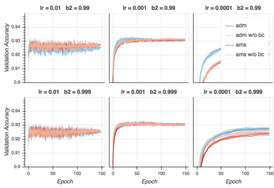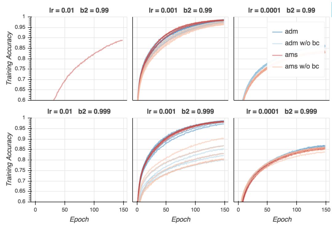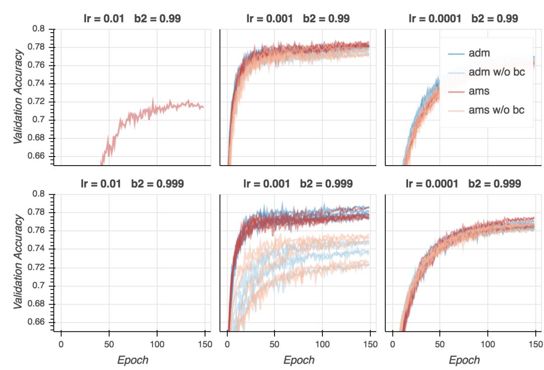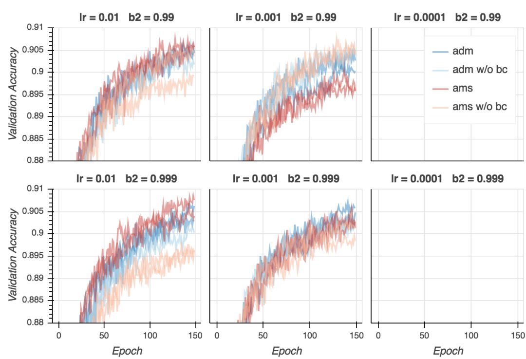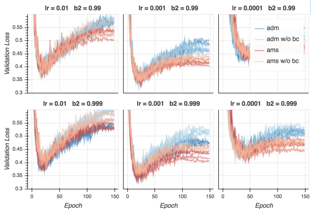 现在是失望时刻。尽管在所有超参数配置上,AMSGrad的验证损失更低,从验证精确性来看,基本是平局。在某些设定下,Adam表现更好(lr = 0.01、b2 = 0.999),在其他一些设定下,AMSGrad(lr = 0.001、b2 = 0.999)表现更好。在所有配置中取得最好结果的是Adam(lr = 0.001、b2 = 0.99),但我认为这一差别并不显著。看起来,给定合适的超参数设定,两个算法的表现差不多好。