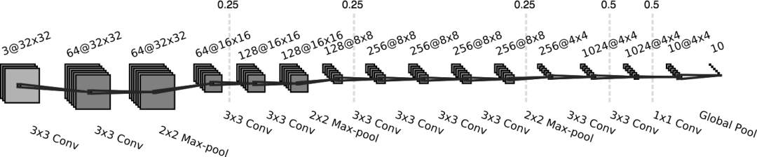 这是我在本文主要部分所用模型的一个较小的版本。在每层中,使用一半的过滤器,每块(block)只使用两个卷积层。我将省略这些试验的结果的解释,因为它们并没有增加了什么新的内容。