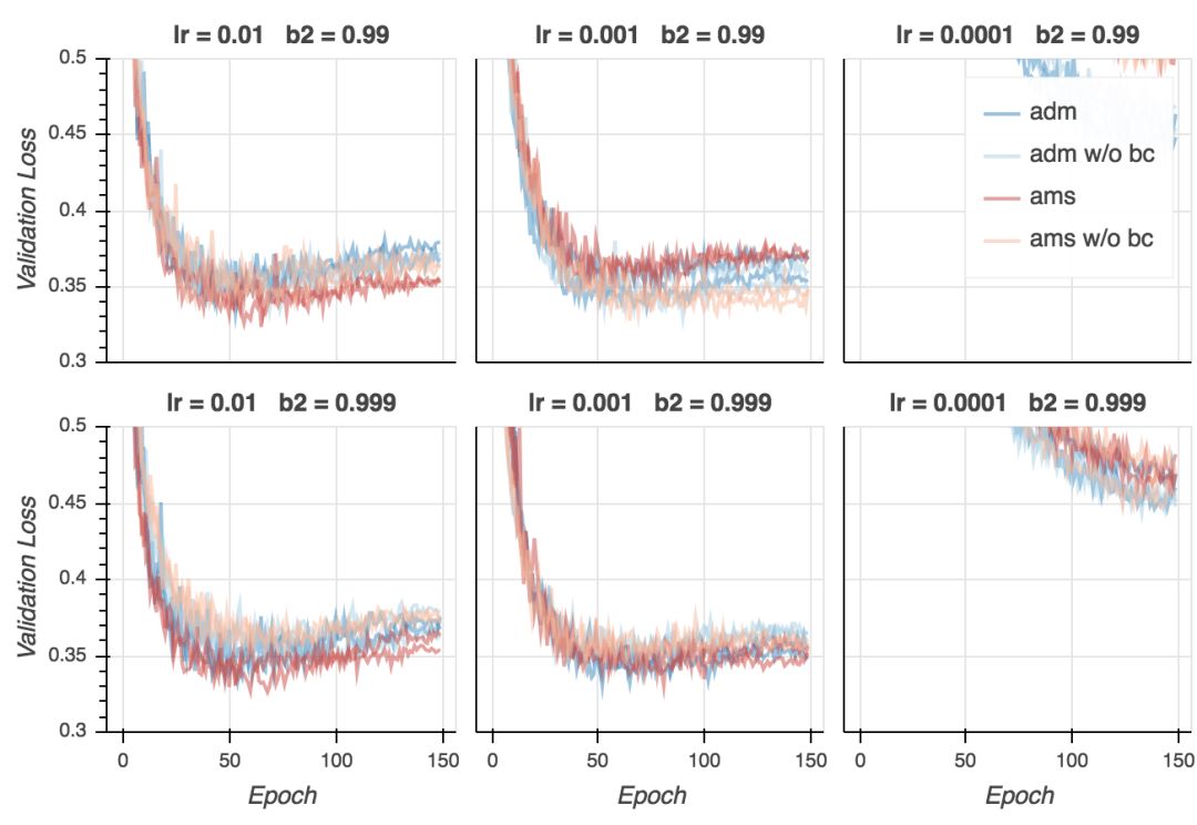验证损失的表现不同。我们看到,AMSGrad持续超越Adam,特别是在后期的epoch中。两个算法达到了相似的最小验证误差(在第20-25个epoch周围),但自此之后,Adam看起来过拟合地更厉害,至少是就交叉熵损失而言。所以AMSGrad可以弥补Adam经常比标准SGD(随机梯度下降)概括性差这一点吗?需要做一些标准SGD的试验来回答这一问题。