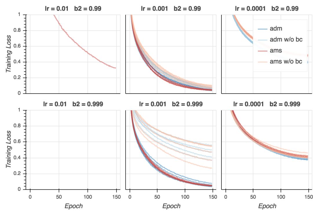 论文指出了Adam收敛性证明的一个致命缺陷,并展示了一个证明成立的Adam变体,AMSGrad。然而,我发现论文对AMSGrad的实际影响的试验评估比较有限。在论文中,作者声称(着重由我所加)“AMSGrad在训练损失和精确度上表现得比Adam好多了。此外,这一表现提升同样转换到了测试损失上。”不幸的是,就我使用的模型和训练方案而言,我的试验不能证实这些: