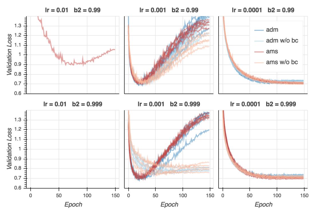 这里情况有所不同。AMSGrad通常给出最低的验证损失(除非我们用了过低的学习率)。然而,在lr = 0.002、b2 = 0.99时,Adam取得了最低的验证损失(差别微乎其微),不过之后发散了。