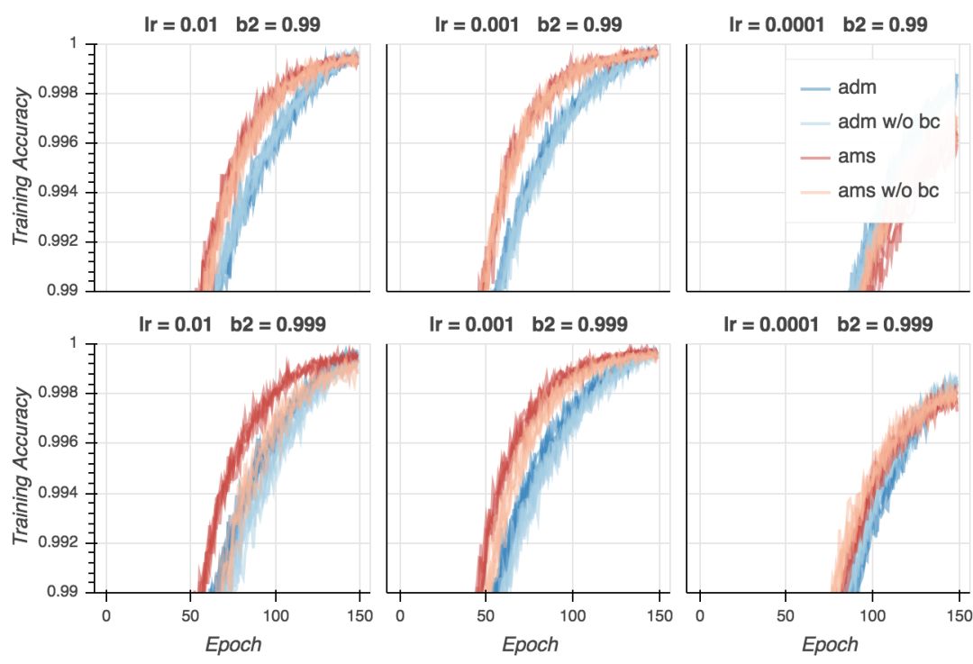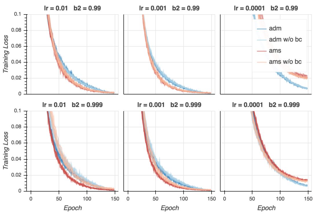 从这些结果来看,在实践层面,相比Adam,AMSGrad并没有明确的优势。结果取决于学习率和beta2的选择。同样,结果并未确认AMSGrad对超参数变动更强韧这一主张。