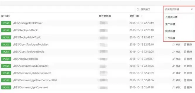 在接口列表页面,右上方点击环境菜单,选择相应的环境,就可以改变所有接口的请求前缀等参数。