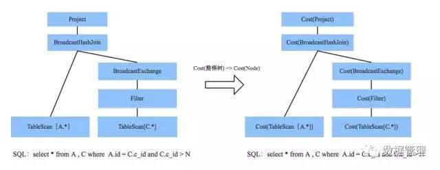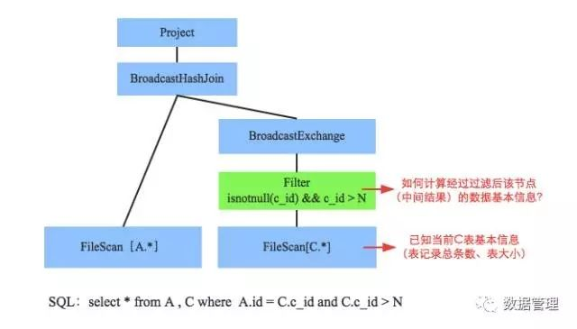 要评估给定整棵树的代价,分而治之只需要评估每个节点执行的代价,最后将所有节点代价累加即可。而要评估单个节点执行实际 代价,又需要知道两点,其一是这种算子的代价规则,每种算子的代价计算规则必然都不同,比如Merge-Sort Join、Shuffle Hash Join、GroupBy都有自己的一套代价计算算法。其二是参与操作的数据集基本信息(大小、总记录条数),比如实际参与 Merge-Sort Join的两表大小,作为节点实际执行代价的一个重要因素,当然非常重要。试想,同样是Table Scan操作,大表和小 表的执行代价必然不同。