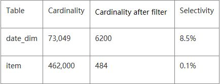 这里就涉及上文提到的Join顺序问题,从原始表来看,date_dime有73049条记录,而item有462000条记录。很显然,如果没有其 他暗示的话,Join顺序必然是store_sales join date_dim join item。但是,where条件中还带有两个条件,CBO会根据过滤条件对 过滤后的数据进行评估,结果如下: