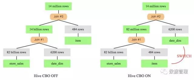 hortonworks曾经对Hive的CBO特性做了相关的测试,测试结果认为CBO至少对查询有三个重要的影响:Join ordering optimization、Bushy join support以及Join simplification,本文只简单介绍一下Join ordering optimization,有兴趣的同学可 以继续阅读这篇文章(HIVE 0.14 Cost Based Optimizer (CBO) Technical Overview)来更多地了 解其他两个重要影响。(下面数据以及示意图也来自于该篇文章,特此注明)
