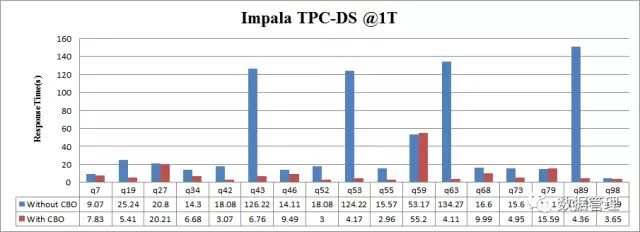 和Hive优化的原理相同,也是针对复杂join的执行顺序、Join的执行策略选择优化等方面进行的优化,本人使用TPC-DS对Impala 在开启CBO特性前后的部分Query进行了性能测试,测试结果如下图所示: