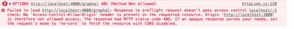 问题所在就是,express-graphql 和apollo-server 不接受除了 GET 和 POST 以外的请求,所以请求失败导致异常出现:OPTIONS http://localhost:4000 405 (Method not allowed).