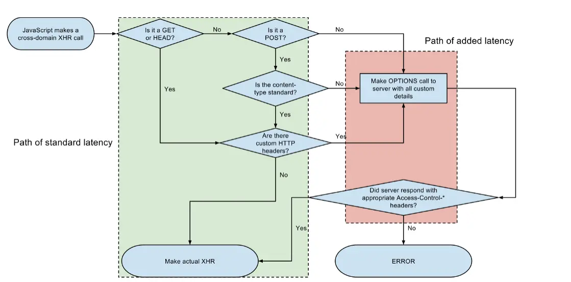实际上,CORS实际上是客户端和服务器之间通信流程的一种规范。在某些情况下,这个流程需要服务器处理HTTP OPTIONS请求,正如下面这个流程图可以所示:跨域资源请求需要额外的OPTIONS HTTP request.