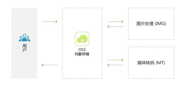 上传文件到OSS后,可以配合媒体转码服务(MTS)和图片处理服务(IMG)进行云端的数据处理,如下图所示: