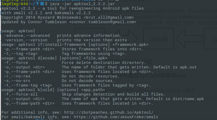 //apktool是一个jar文件所以通过java运行jar的方式 java -jar apktool.jar d com.sejian.apk